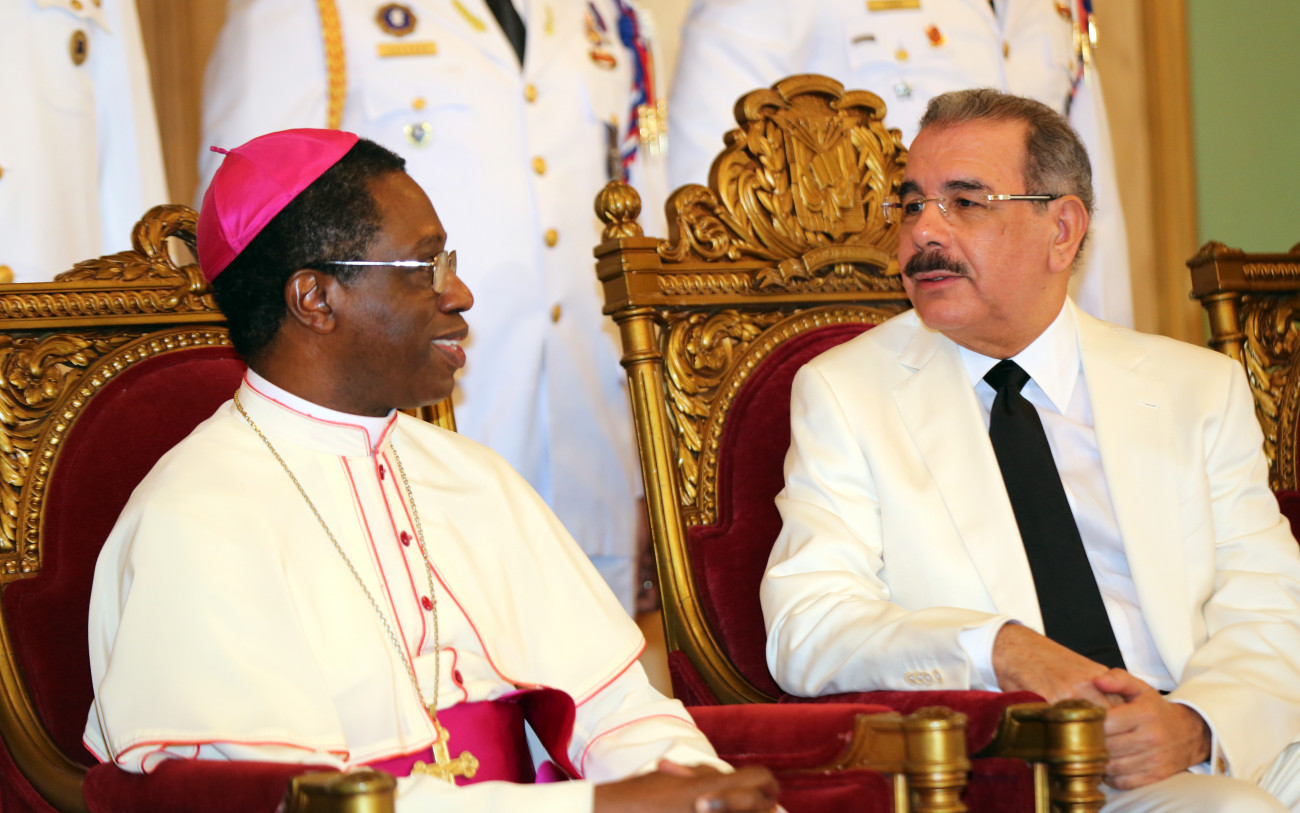 El presidente Danilo Medina conversa con Jude Thaddeus Okolo, nuevo Nuncio Apostólico de Su Santidad, Papa Francisco, tras la presentación de las cartas credenciales en ceremonia realizada hoy.