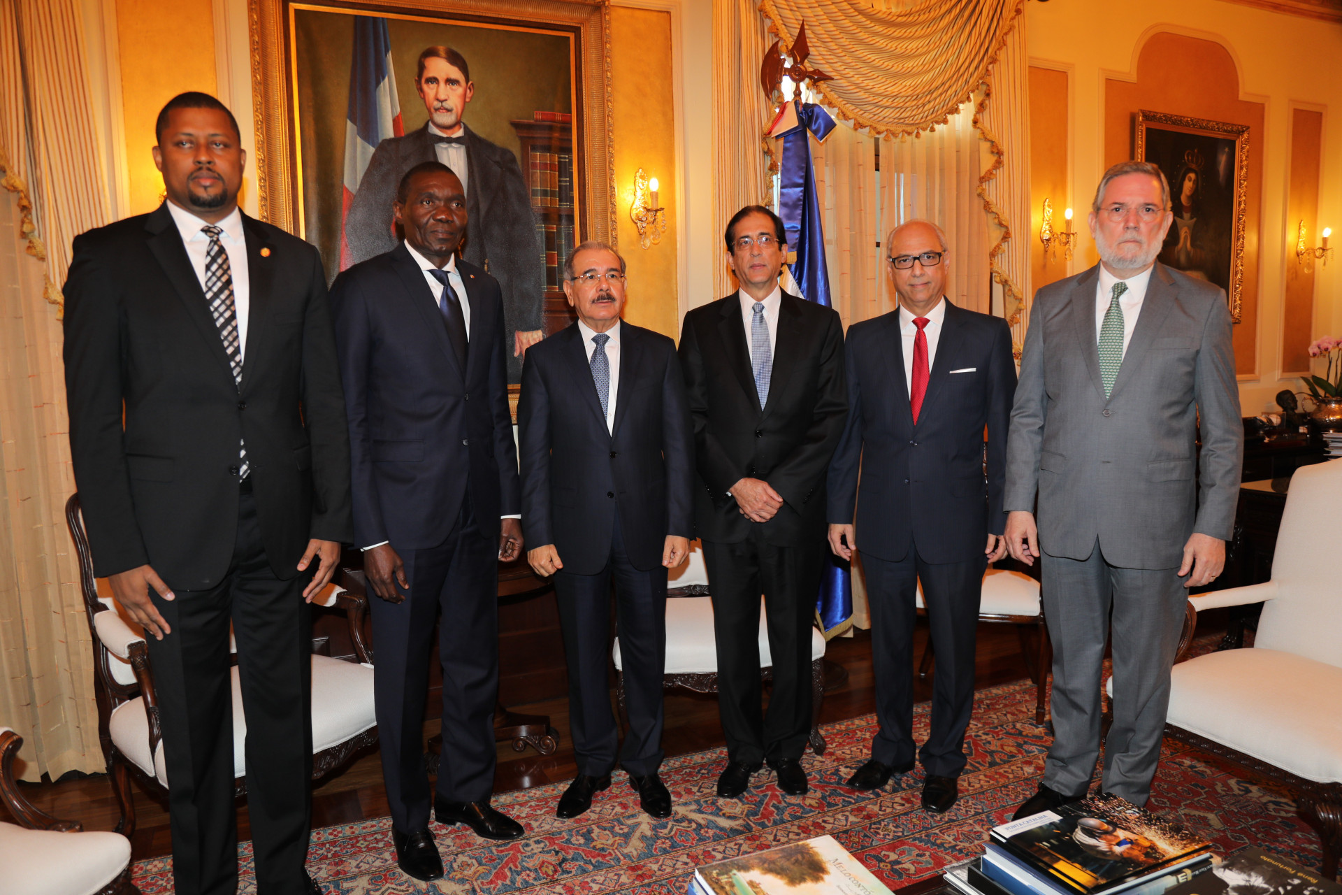 Gary Bodeau, Joseph Lambert, presidente Danilo Medina, Gustavo Montalvo, Flavio Darío Espinal y Roberto Rodríguez Marchena, durante encuentro en el Palacio Nacional.