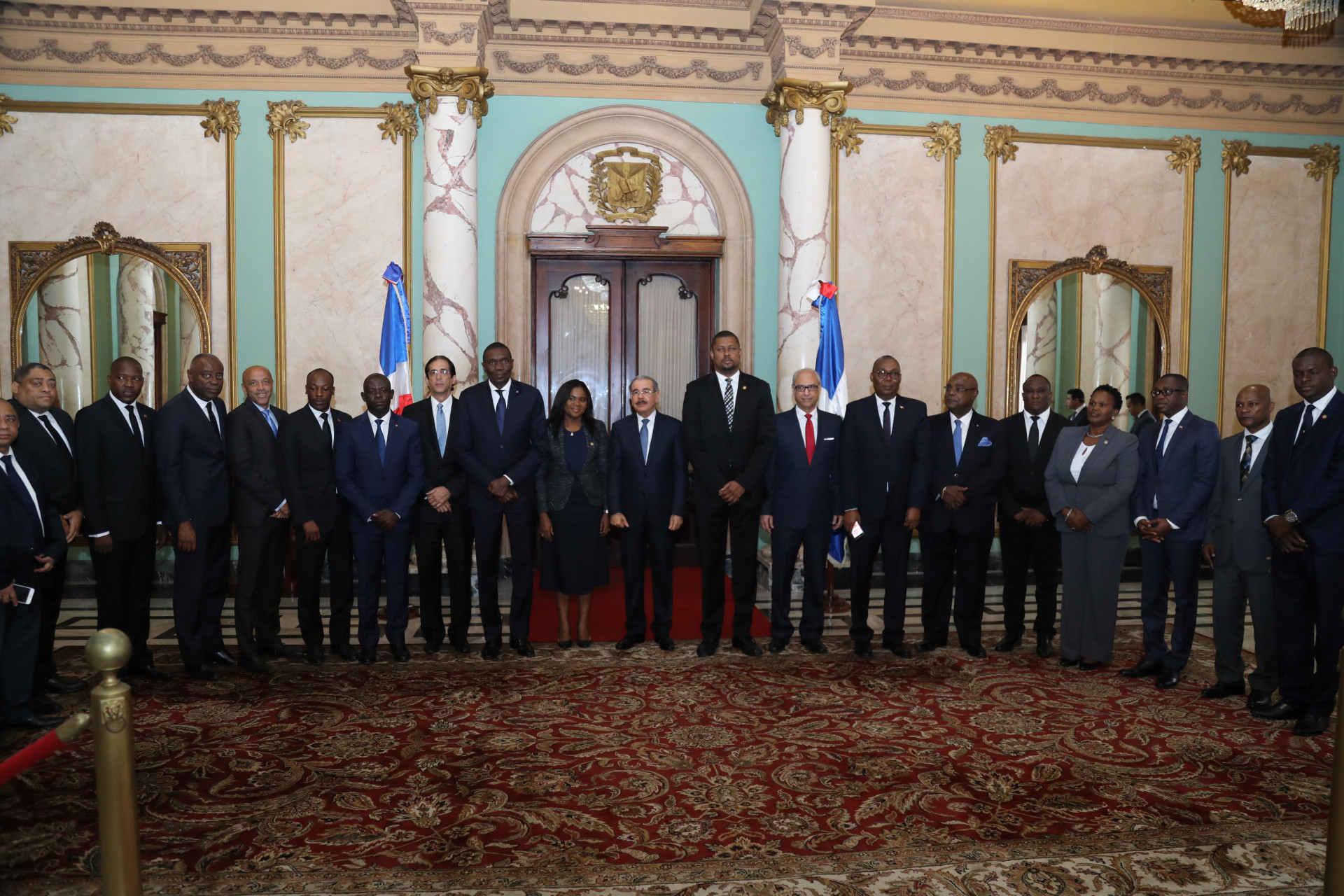 El presidente Danilo Medina con los presidentes del Senado y de la Cámara de Diputados de Haití, Joseph Lambert y Gary Bodeau, respectivamente. Les acompañaron otros miembros del Senado y de la Cámara de Diputados del vecino país.