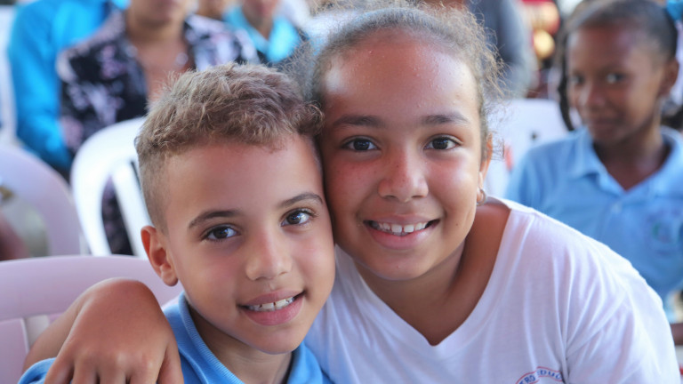 Estudiantes felices por la inauguración de su nueva escuela entregada hoy en acto encabezado por el presidente Danilo Medina.