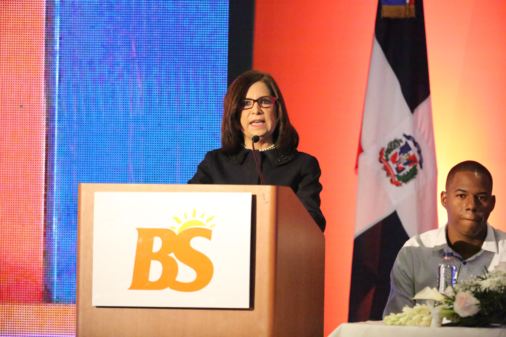 Directora ejecutiva de Banca Solidaria, Maira Jiménez, durante su discurso en el evento.