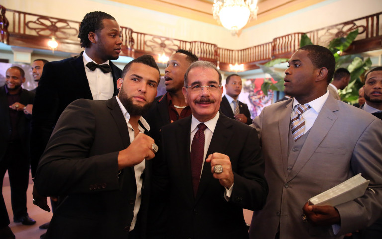 El Mandatario, emocionado, compartiendo con los jugadores del equipo dominicano del III Clásico Mundial de Béisbol