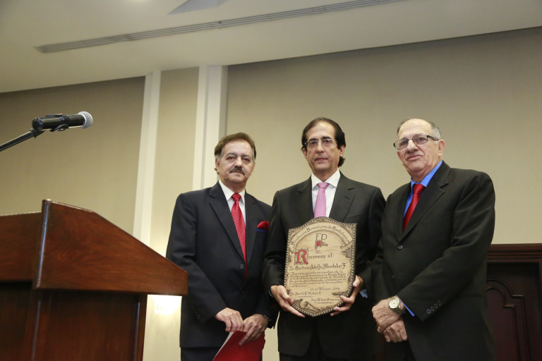 El ministro de la Presidencia, Gustavo Montalvo, al momento de recibir la distinción de manos de Ernesto Díaz, director del Instituto Dominicano de Cardiología.