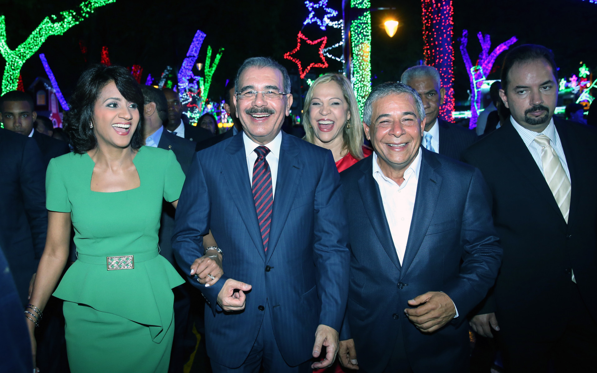 El presidente Danilo Medina, la primera dama, Cándida Montilla de Medina, el alcalde del Distrito Nacional, Roberto Salcedo, su esposa, Angélica Sanz, y Oscar Peña, presidente de Claro Dominicana, durante el recorrido por el Parque Iberoamérica con motivo de la inauguración de "Brillante Navidad".