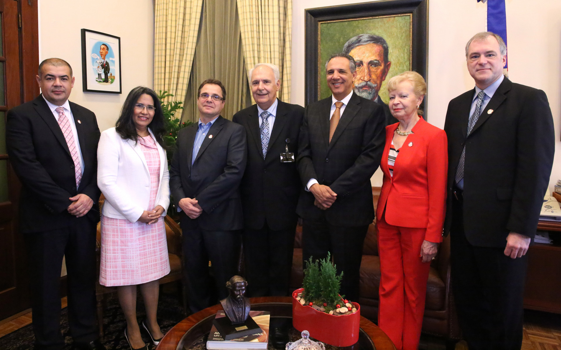 La delegación de empresarios canadienses que visitó al ministro administrativo de la Presidencia, José Ramón Peralta, estuvo presidida por el Asesor de Negocios del Poder Ejecutivo, Gerard Trudeau y el director de Operaciones de la Federación de Empresarios de la Agricultura, Fernando Borja. También estuvo presente la ministra de Trabajo, Maritza Hernández.