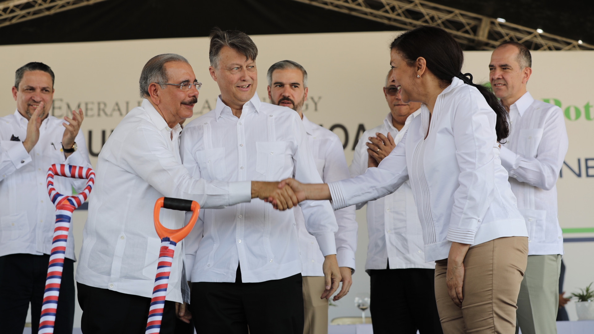 El presidente Danilo Medina y ejecutivos de la empresa, durante la recepción inaugural por el inicio del Parque Solar Canoa, que abastecerá de luz a 10 mil hogares. Foto: Luis Ruiz Tito/Presidencia República Dominican Enlace noticia: presidencia.gob.do/noticias/parque-solar-canoa-abastecera...
