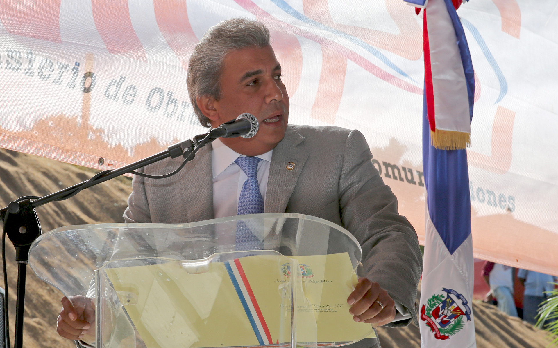 Carlos Castillo, senador por la provincia de San José de Ocoa, se dirige a los presentes durante la ceremonia de entrega de obras, entre las que figuran el Cruce de Ocoa-San José de Ocoa, el puente Sabana Larga y el asfaltado de calles en 17 sectores.