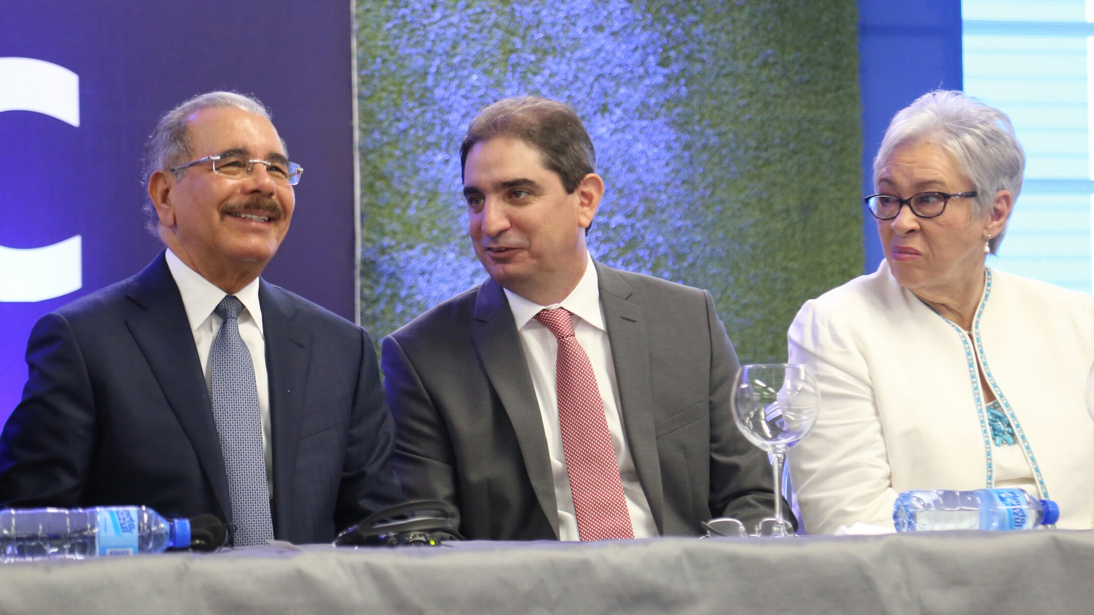Presidente Danilo Medina mientras conversa con Paolo Tolari, director general de la empresa Medtronic, y la ministra de Salud, Dra. Altagracia Guzman Marcelino.