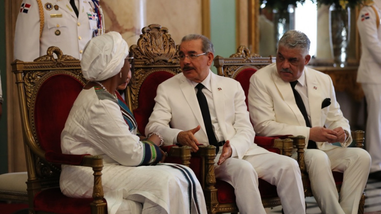 El presidente Danilo Medina recibe las cartas credenciales de la nueva embajadora de la República de Guinea en el país, señora Hawa Diakite. Junto a ellos, el canciller Miguel Vargas Maldonado.