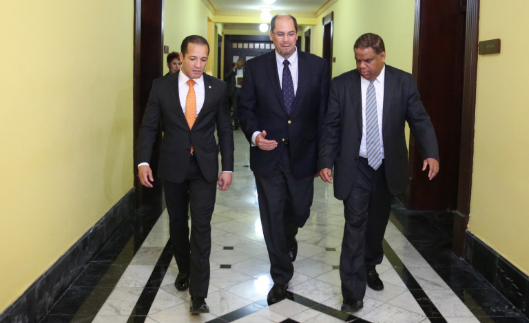 El candidato presidencial de Panamá José Domingo Arias, camina acompañado de Juan de los Santos, alcalde de Santo Domingo Este y Danilo Díaz, asistente especial del Mandatario.
