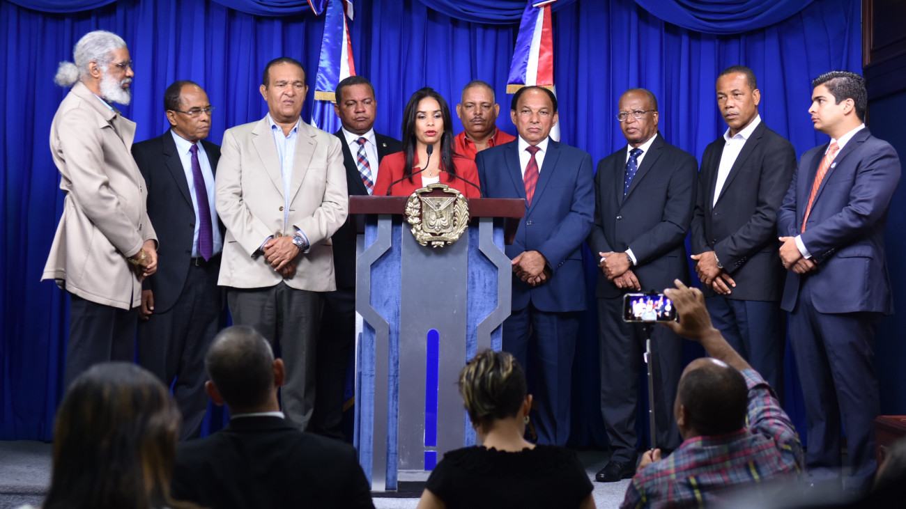 Sindicalistas del sector transporte, Antonio Marte, Reynaldo Pérez, Juan Hubieres, Alfredo Pulinario (Cambita); el diputado Rafael Arias y los técnicos Onéximo González y Antonio Brito, presentes en el encuentro con la prensa.