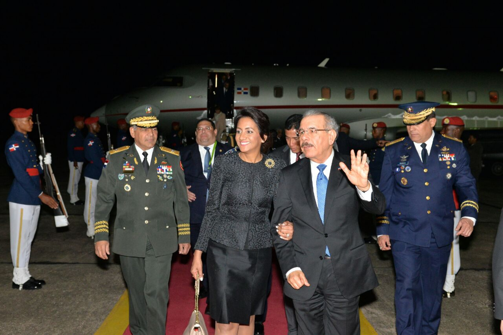 El presidente Danilo Medina y esposa señora Cándida Montilla de Medina, quien, durante su permanencia en Perú, también agotó una amplia agenda de trabajo, fueron recibidos por el ministro de Defensa, teniente general (ERD), Rubén Darío Paulino Sem.