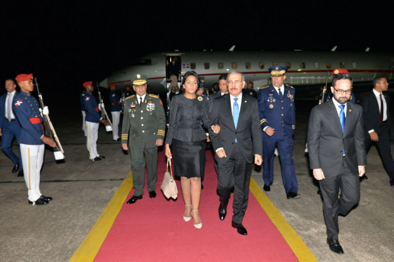 El arribo del jefe de Estado dominicano se produjo por la Base Aérea de San Isidro, a las 10:28 de la noche, acompañado de su esposa Cándida Montilla de Medina.