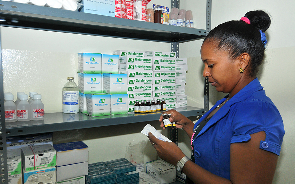 Una dependiente de la farmacia del hospital Teófilo Gautier mientras chequea una indicación de un medicamento.