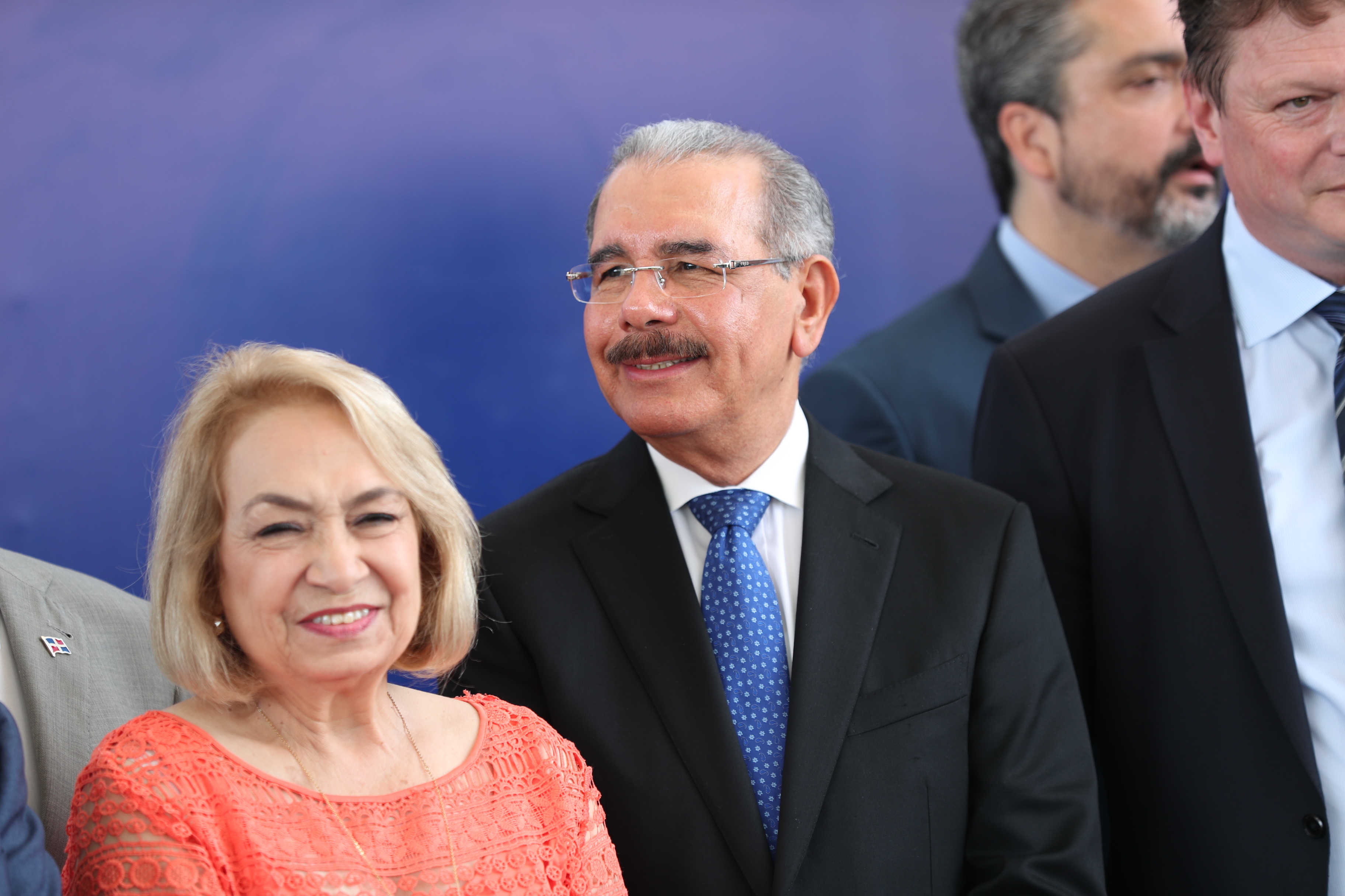 El presidente Danilo Medina y Luisa Fernández, directora ejecutiva del Consejo Nacional de Zonas Francas, durante el primer palazo al inicio de construcción de la tercera planta de manufactura de Fresenius Kabi en la República Dominicana.
