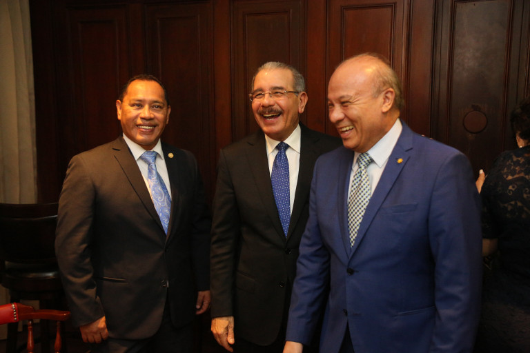 El presidente Danilo Medina mientras conversa con el embajador de Guatemala en República Dominicana, Rudy Armando Coxaj, y José Luis Chea Urrutia, ministro de Cultura y Deportes de Guatemala, país invitado de honor del evento.