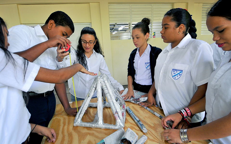 Estudiantes guiados por la maestra Kiara Labriola, construyen una pirámide a base de papel periódico.