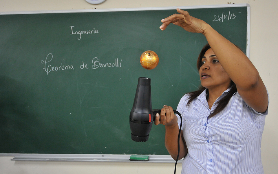 Una de las profesoras del Liceo Científico Doctor Miguel Canela Lázaro en Salcedo, provincia Hermanas Mirabal, imparte formación sobre el Teorema de Bernoulli, usando como herramienta un blower de pelo.