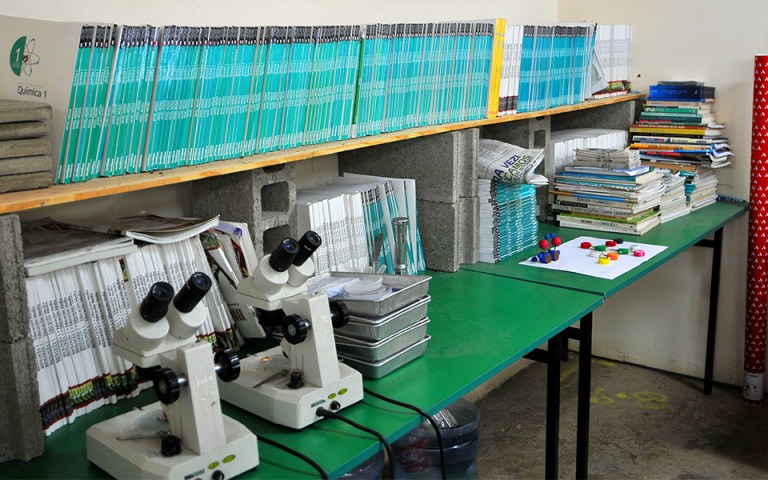 Una de las áreas de Liceo Científico Doctor Miguel Canela Lázaro, donde se observan libros y equipos de bioanálisis.