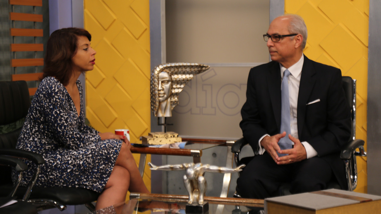 Le acompaña, la periodista Amelia Deschamps, conductora del programa El Día, que se transmite por Telesistema, canal 11.