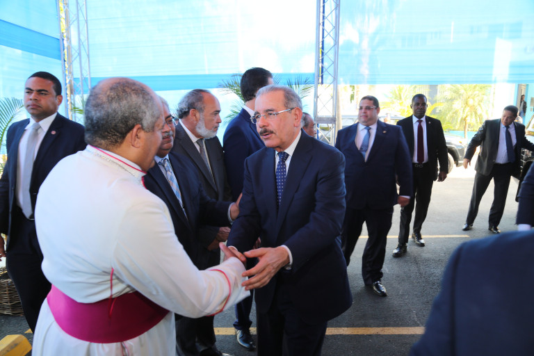 El presidente Danilo Medina saluda a monseñor Julio Cesar Corniel, obispo de la Diócesis de Puerto Plata, quien bendijo las instalaciones.
