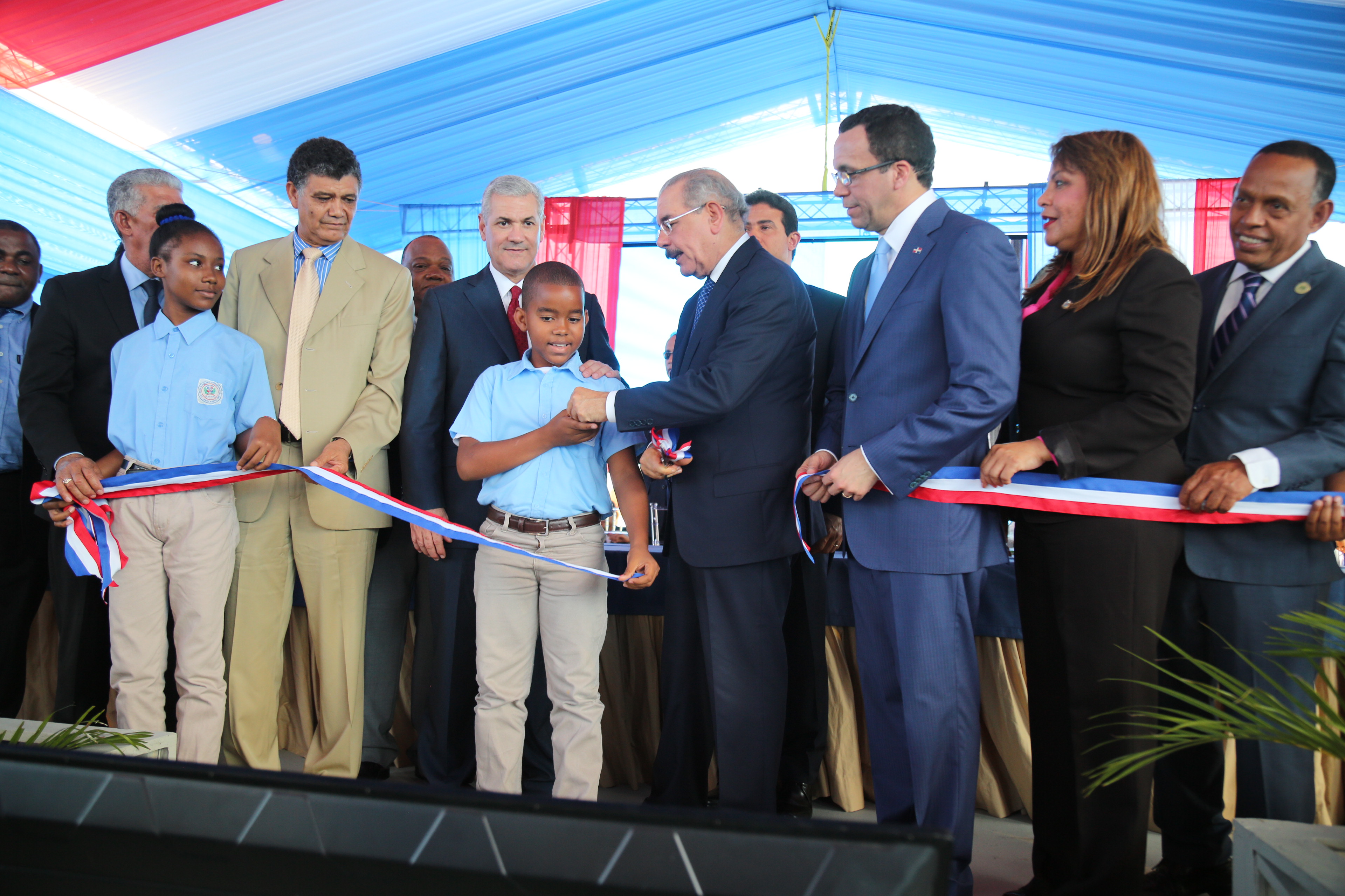 El presidente Danilo Medina corta la cinta para dejar inaugurado el Centro Educativo de Nivel Primario "Rosario Evangelina Solano", donde 945 niños estudiarán bajo la modalidad Jornada Escolar Extendida.