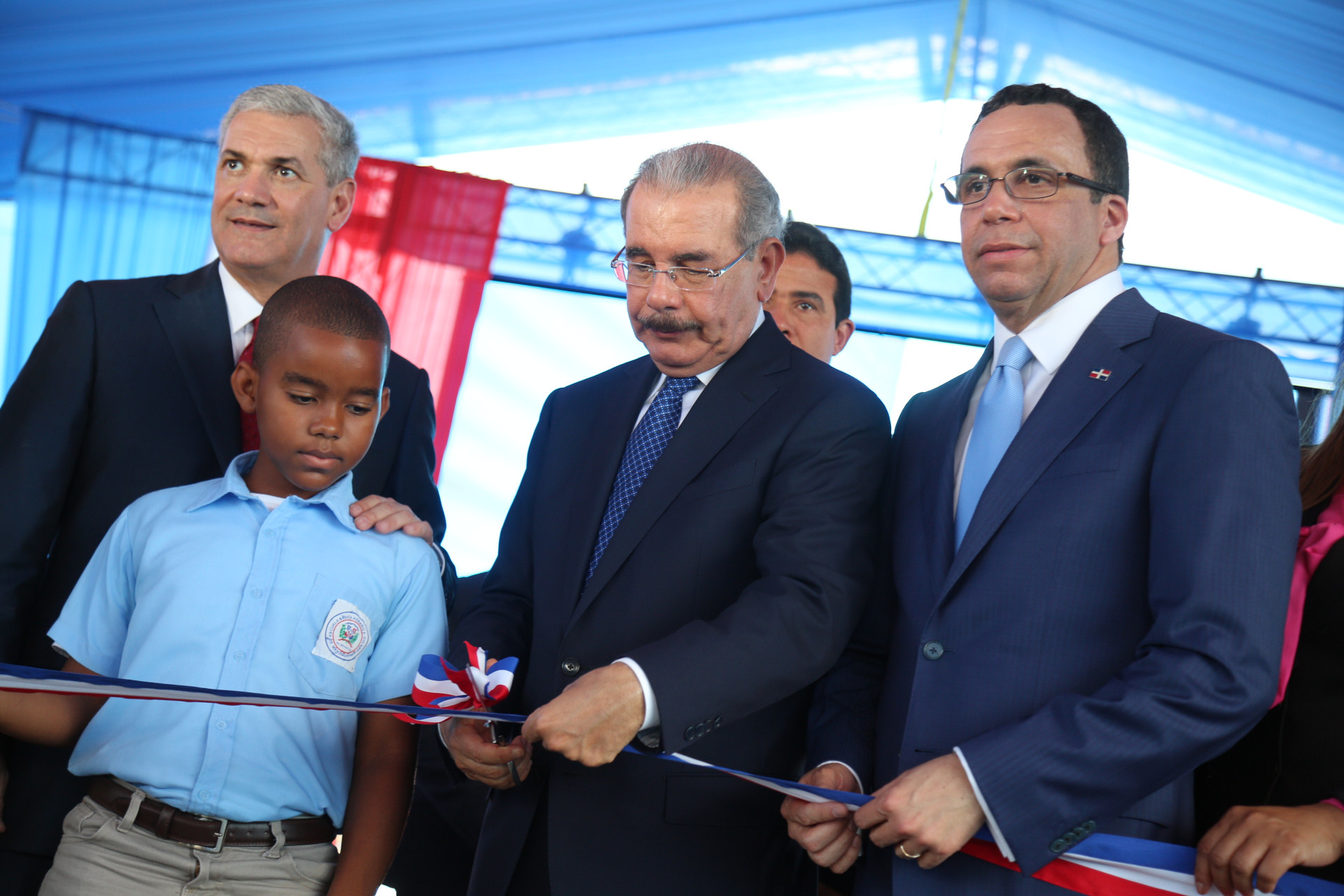 El presidente Danilo Medina corta la cinta para dejar inaugurado el Centro Educativo de Nivel Primario "Rosario Evangelina Solano", donde 945 niños estudiarán bajo la modalidad Jornada Escolar Extendida.
