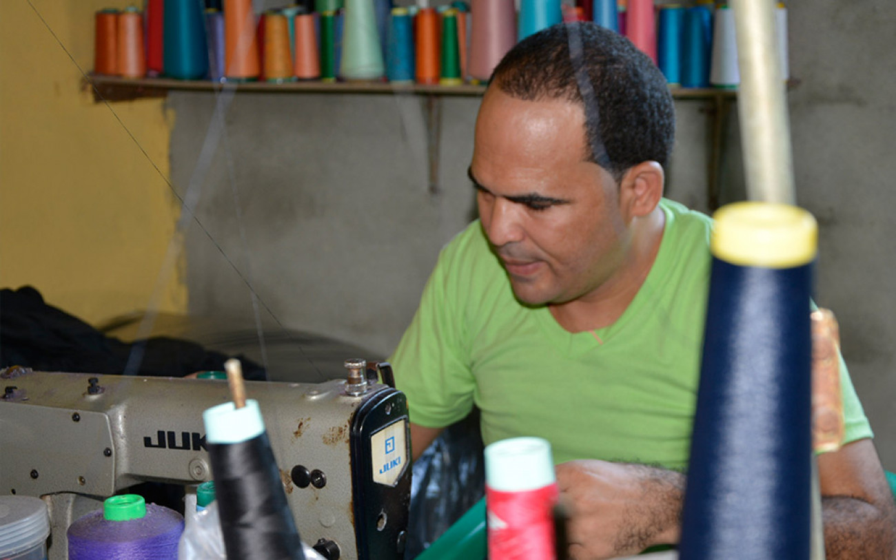 Pedro Pablo Mosquea, propietario de la sastrería, mientras realiza parte de sus habitules labores y nos relata su experiencia luego de recibir el préstamo financiero aprobado por el Estado a través de Banca Solidaria.