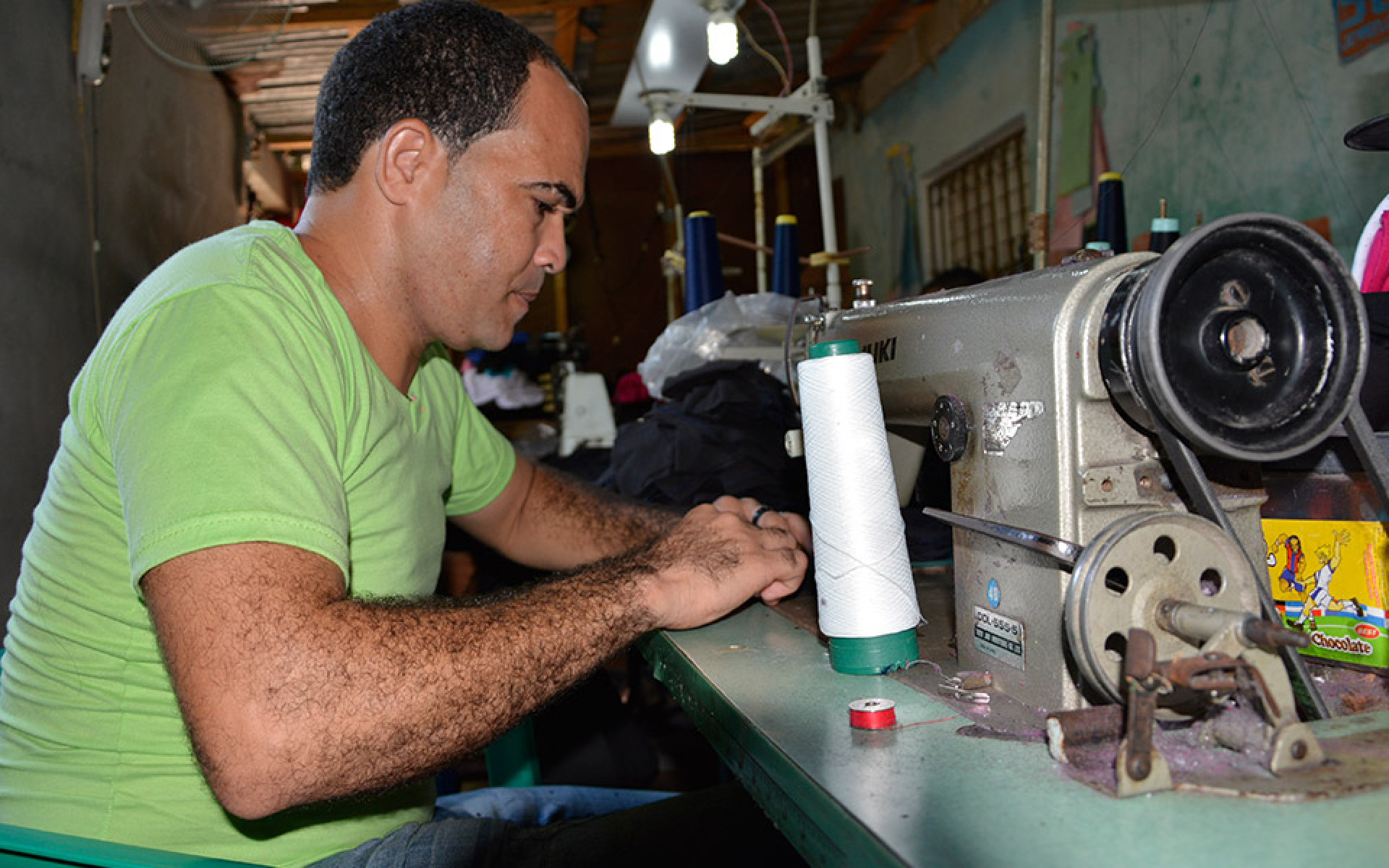 El propietario de la satrería, Pedro Pablo Mosquea, en labores de confección de prendas de vestir.