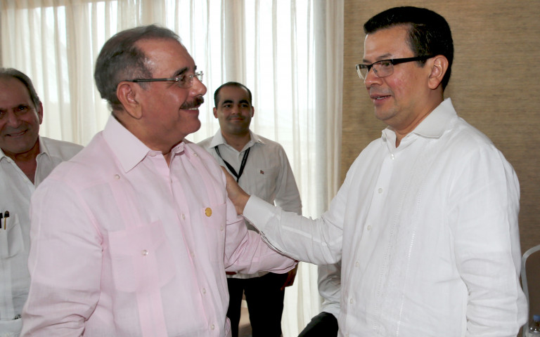 El presidente Danilo Medina recibe saludos de Hugo Martínez, secretario general del SICA, durante la cuadragésimo segunda Cumbre de Jefes de Estado y de Gobierno del organismo regional.