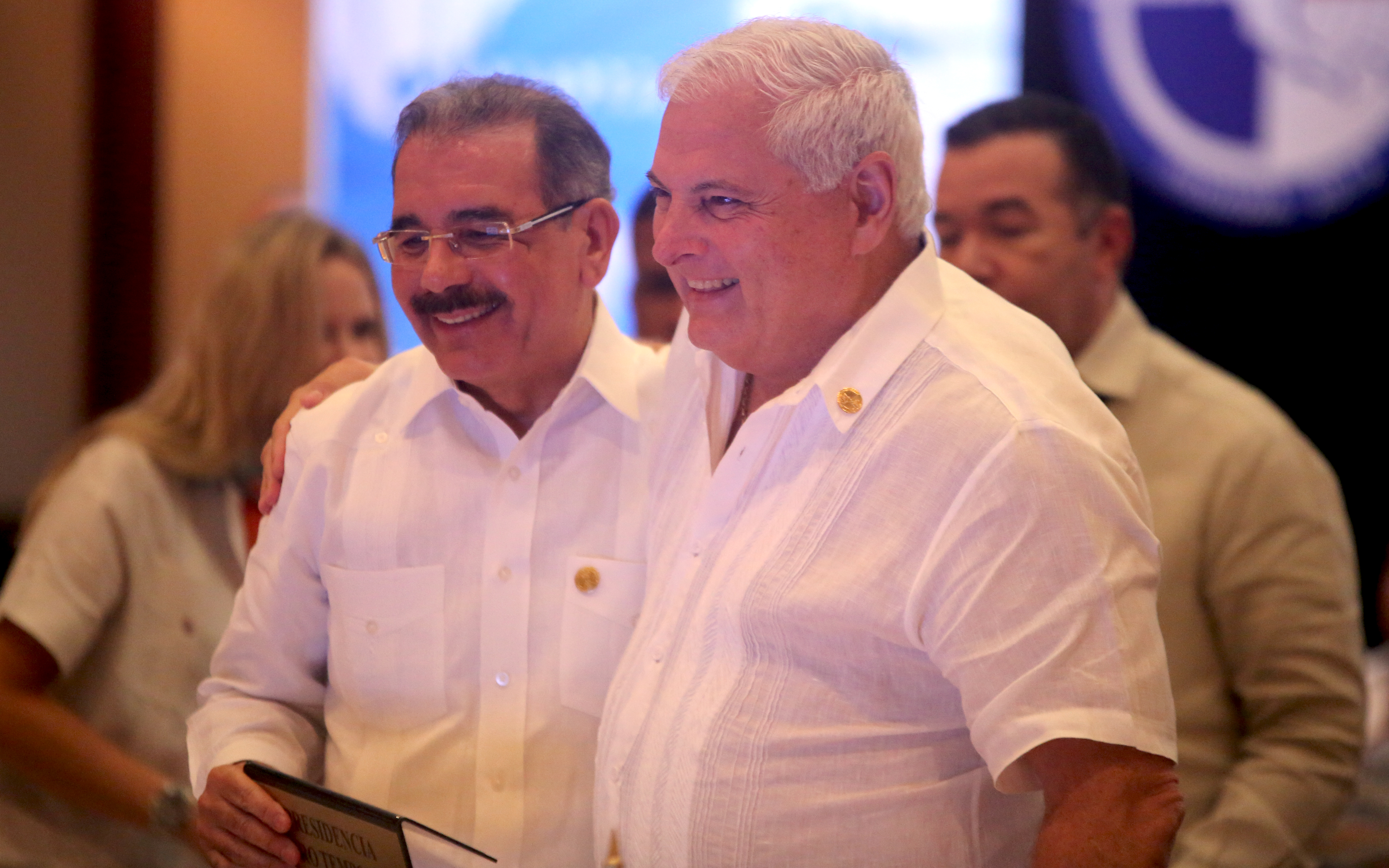 Presidente Medina recibe un afectuoso abrazo de su homólogo panameño, Ricardo Martinelli, quien formalizó el traspaso de la Presidencia Pro Tempore a la República Dominicana.