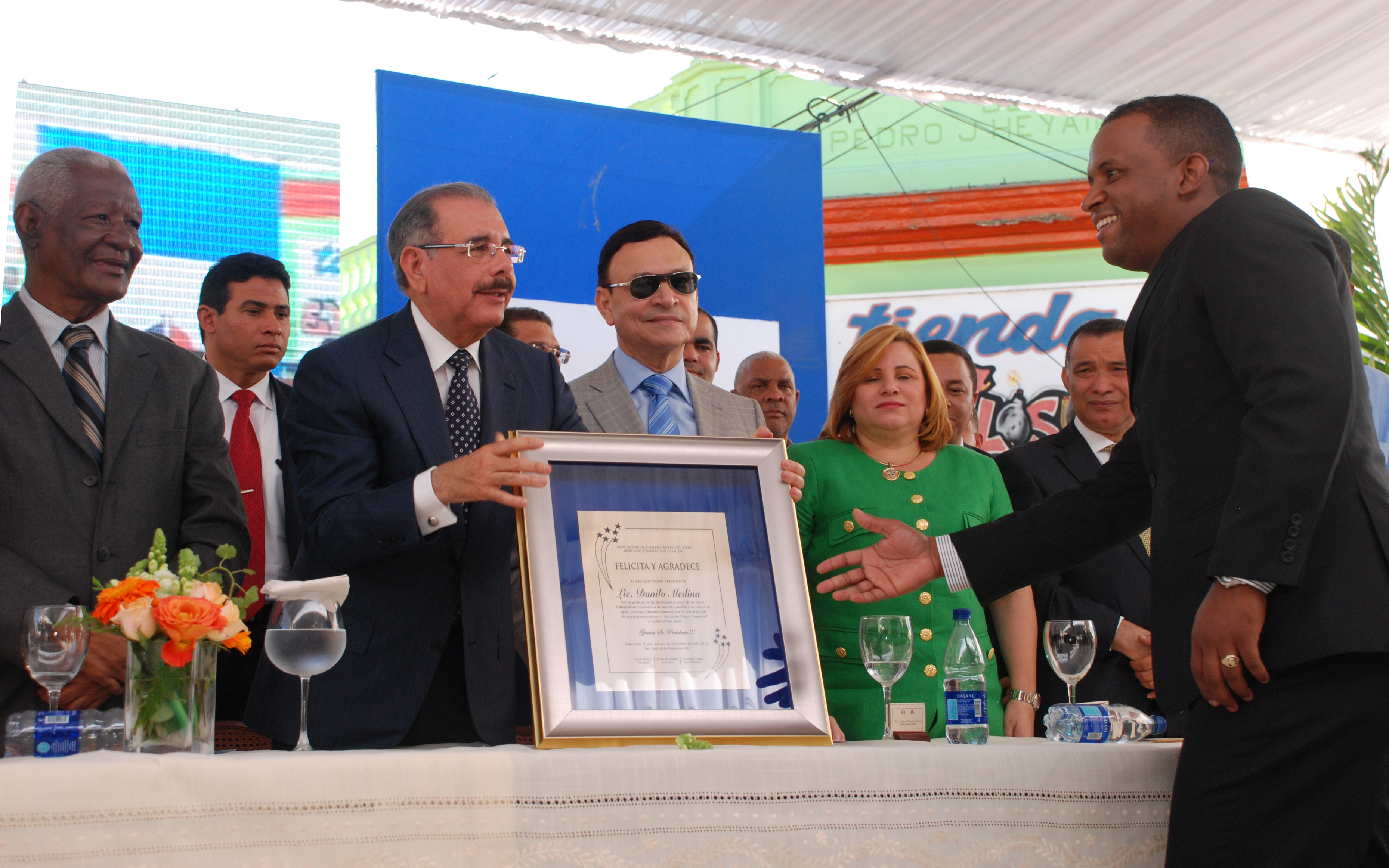 Presidente Medina recibe placa de reconocimiento de parte del presidente de la Asociación de Comerciantes del Mercado Viejo de San Juan, Edward Luna, por la construcción de la nueva plaza comercial.