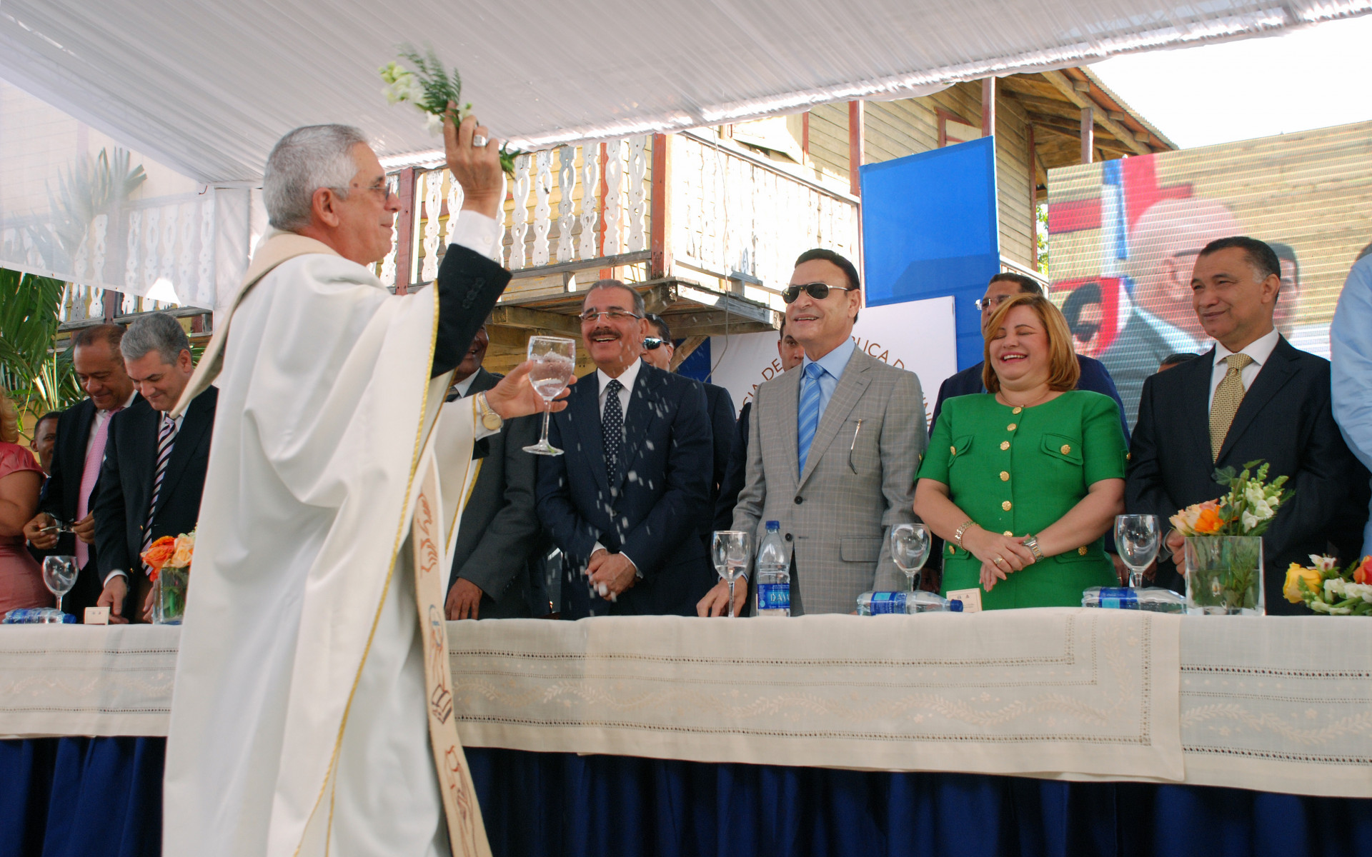 Participación del obispo José Dolores Grullón, quien impartió la bendición a las nuevas obra y a los presentes, en acto encabezado por el presidente Danilo Medina;los ministros Administrativo, José Ramón Peralta; de Obras Públicas, Gonzalo Castillo, el director del Indrhi, Olgo Santana; el director del Instituto Agrario Dominicano, Radhamés Valenzuela; Mícalo Bermúdez, presidente de una de las empresas constructoras; la vicepresidenta de la Cámara de Diputados, Lucía Medina; la alcaldesa, Hanoi Sánchez, y William De Oleo entre otras autoridades civiles y militares.