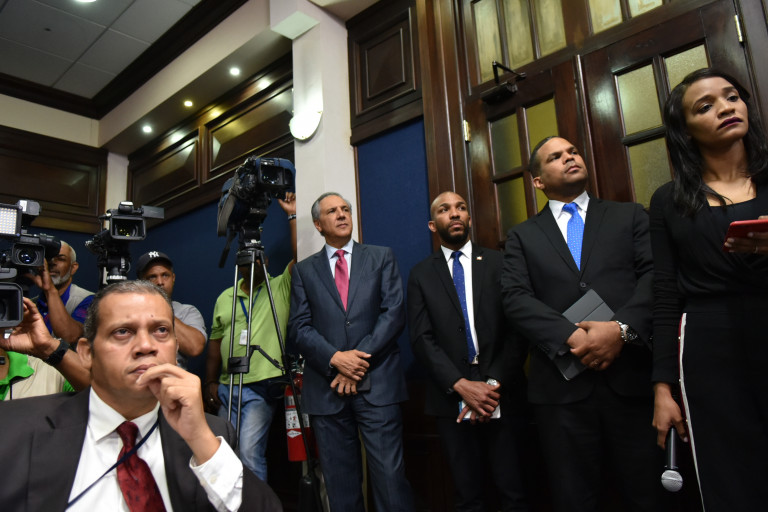 Participantes en la rueda de prensa encabezada por el Dr. Flavio Darío Espinal, consultor jurídico del Poder Ejecutivo, efectuada hoy en el Salón Orlando Martínez del Palacio Nacional.