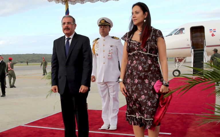 El presidente Medina es recibido por la viceministra de Relaciones exteriores de Venezuela, Verónica Guerreo, a su llegada al aeropuerto internacional Simón Bolívar, en Caracas.