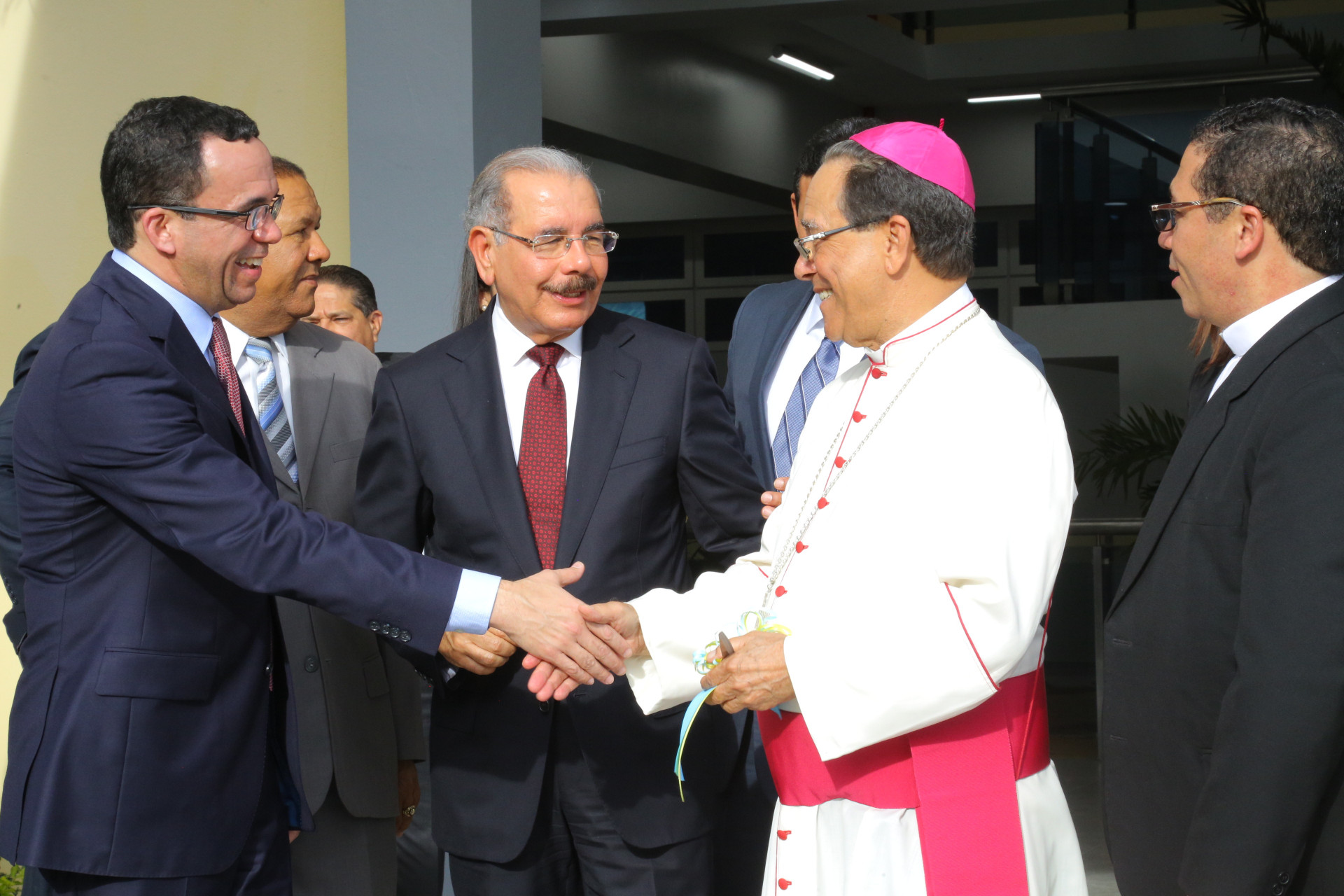 Llegada del presidente Danilo Medina a las nuevas instalaciones del centro educativo, donde fue recibido por el obispo de la Diócesis de La Altagracia y rector de la academia, monseñor Gregorio Nicanor Peña Rodríguez.