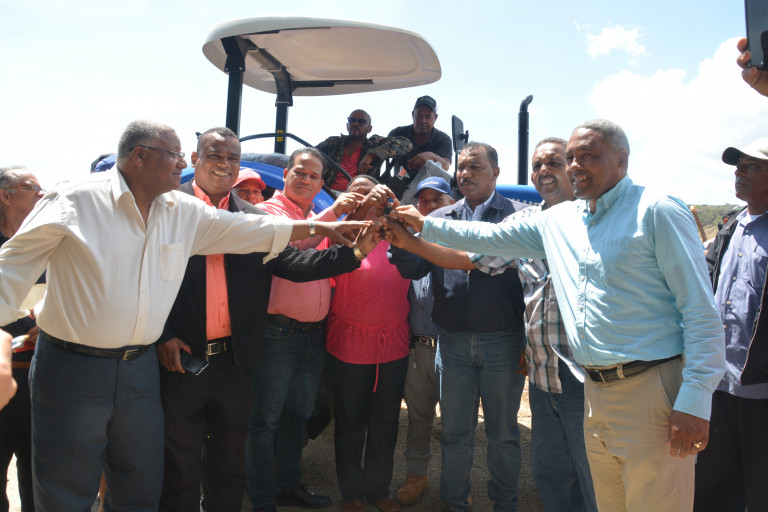 El director del Instituto Agrario Dominicano (IAD), Emilio Toribio Olivo entrega la llave del tractor con su rastra prometido por el presidente Danilo Medina a productores del distrito municipal Las Paredes agrupados en las asociaciones San Isidro Labrador y Cristóbal Colón, de Luperón.
