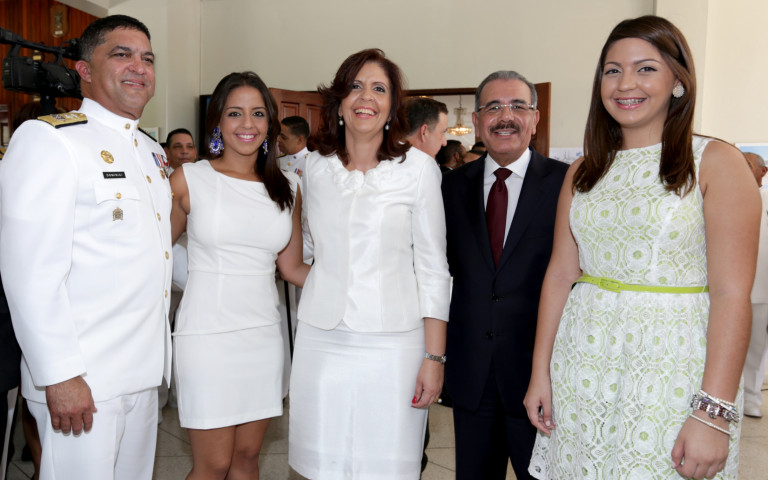 El presidente Danilo Medina, el comandante general de la Armada de República Dominicana, vicealmirante Edwin Rafael Dominici Rosario junto la señora Desiree Núñez de Dominici, presidenta de la Asociación de Esposas de Oficiales de la institución naval, entre otras personalidades.
