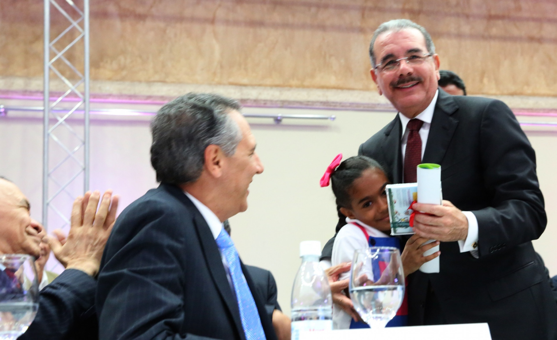 El presidente Danilo Medina es saludado por una niña durante su participación en la Cena de la Confraternidad del Comercio por celebrarse el Día Nacional del Detallista.
