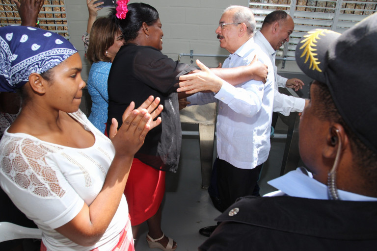 El presidente Danilo Medina al ser recibido por integrantes de la Cooperativa de Mujeres hacia el Desarrollo de Samaná (COOPMUDESA), a su llegada a la planta procesadora.