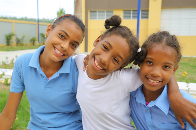 Estudiantes felices por la apertura del Centro de Educación Secundaria Pedro Mir, entregado hoy por el presidente Danilo Medina en el sector Invidorex, en Santo Domingo Este.