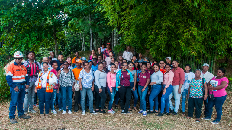 Representantes de la Barrick Pueblo Viejo y comunitarios de Cotuí, en la provincia de Sánchez Ramírez, durante labores de recuperación ambiental en la zona.