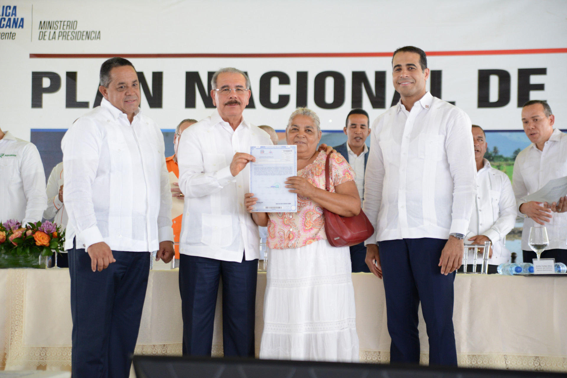 Acto de entrega de títulos definitivos de solares y parcelas a productores de varias comunidades de Monte Plata, encabezado por el presidente Danilo Medina, el director del IAD y el director de la CPTTE.