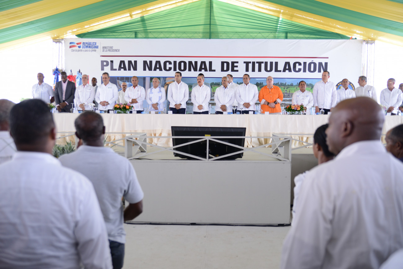 Acto de entrega de títulos definitivos de solares y parcelas a productores de varias comunidades de Monte Plata, encabezado por el presidente Danilo Medina, el director del IAD y el director de la CPTTE.