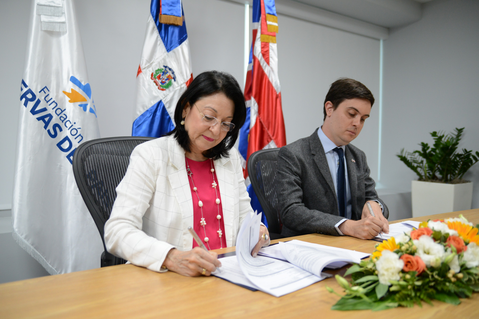 Rosa Rita Álvarez, presidenta ejecutiva de la Fundación Reservas del País y Maxwell Irving, subjefe de Misión de la Embajada Británica en Santo Domingo, durante la firma del acuerdo en representación de ambas instituciones.