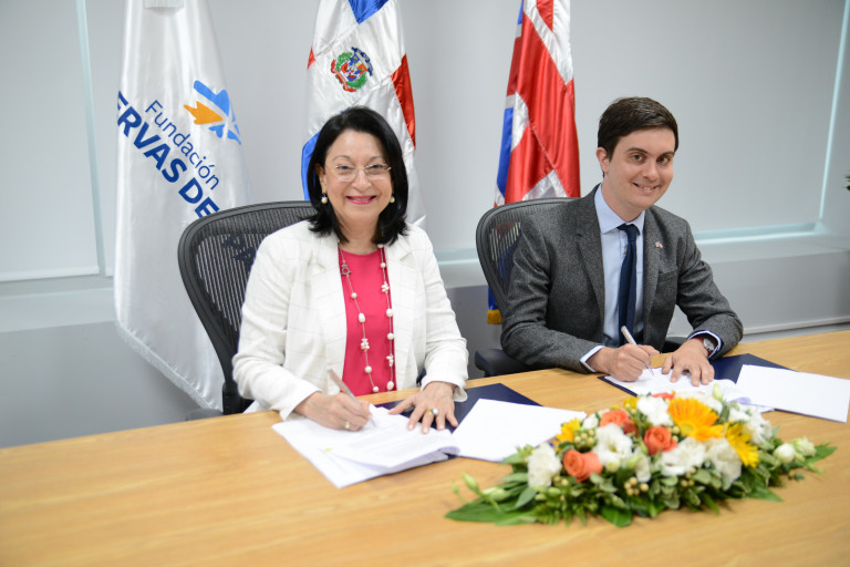 Rosa Rita Álvarez, presidenta ejecutiva de la Fundación Reservas del País y Maxwell Irving, subjefe de Misión de la Embajada Británica en Santo Domingo, durante la firma del acuerdo en representación de ambas instituciones.