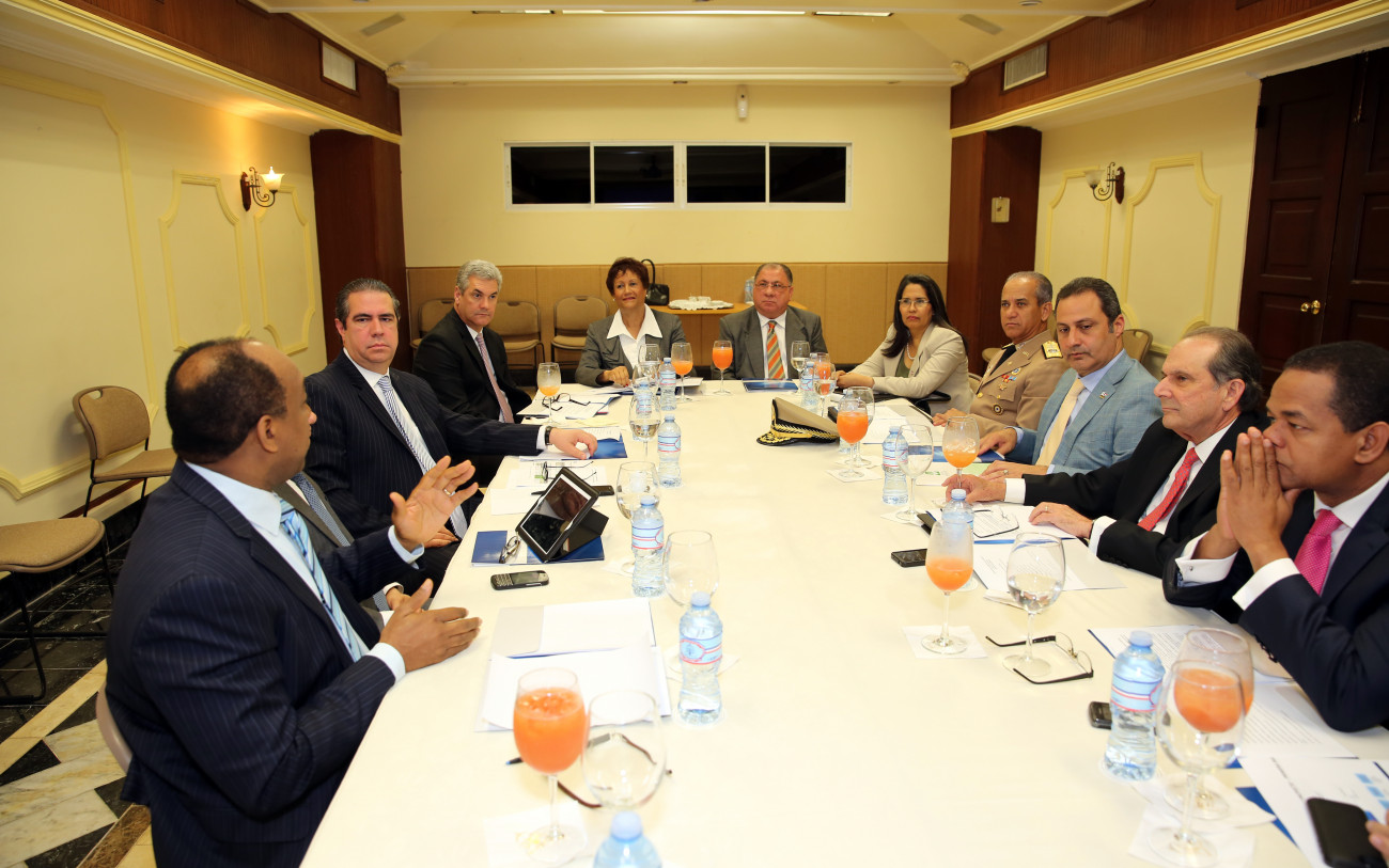 Encabezando el encuentro, figuran al centro, los ministros de Interior y Policía, José Ramón Fadul; ministro de Obras Pública, Gonzalo Castillo; ministro de Turismo, Francisco Javier Garcia; ministro de las Fuerzas Armadas,Sigfrido Pared Pérez; viceministro de Relaciones Exteriores, y canciller en funciones, José Manuel Trullols, y el presidente del Senado, Julio César Valentin, entre otros.
