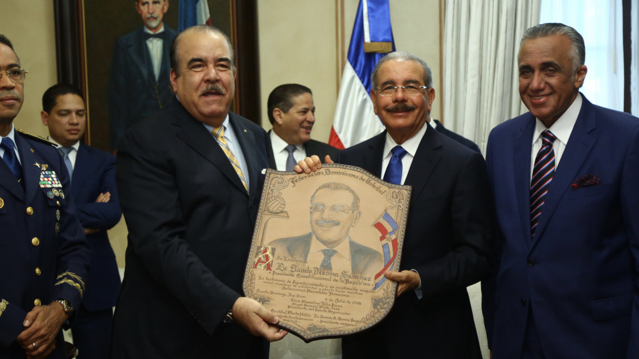 Cristóbal Marte, presidente del Proyecto de Selecciones Nacionales de Voleibol Femenino, junto a integrantes del equipo, entregaron un reconocimiento al presidente Danilo Medina por los aportes que ha hecho a esa importante disciplina.