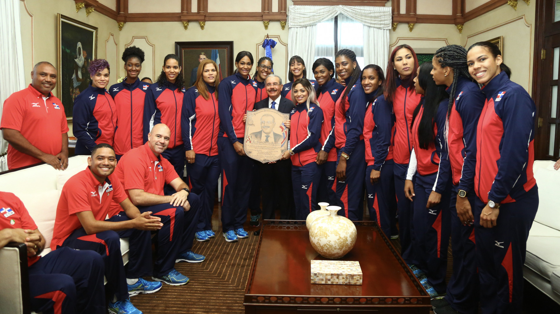 El presidente Danilo Medina junto a integrantes del Equipo Nacional de Voleibol Femenino, presentes durante el encuentro en el Palacio Nacional.