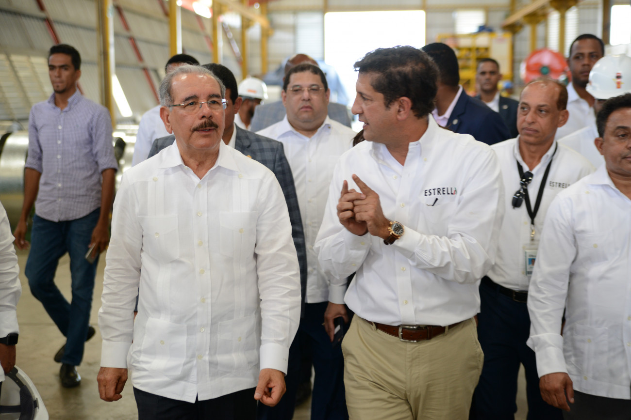 El presidente Danilo Medina en compañía del empresario Manuel Estrella, durante su visita a la planta de láminas de Aluzinc North West Industries (NWI), del Grupo ESTRELLA, ubicada en Villa Vásquez, provincia Montecristi.